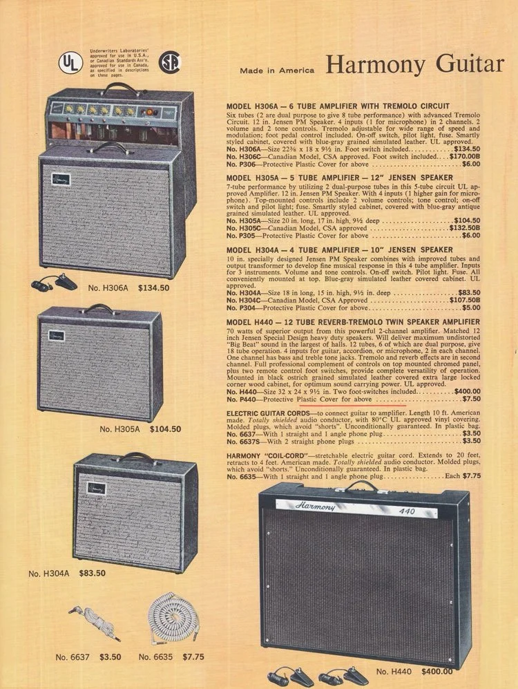So what’s the deal with this amp? Well, it is a combo amp that was part of Harmony’s early 1960’s amp line that was sold through their (by then) parent company, Sears, Roebuck & Co. As you can see from the advertisement below, the H305c was the Canadian version of the H305A. I would love it if someone out there could provide a bit more information about how the “CSA Approved” aspect of this amp might differ from its American brother!
